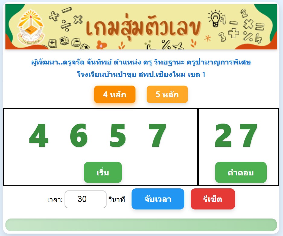 การพัฒนาผลสัมฤทธิ์ทางการเรียนวิชาคณิตศาสตร์ เรื่อง จำนวนนับ และการบวก การลบ การคูณ การหาร โดยใช้เกมสุ่มตัวเลข สำหรับนักเรียนชั้นประถมศึกษาปีที่ 6 โรงเรียนบ้านป่าขุย |